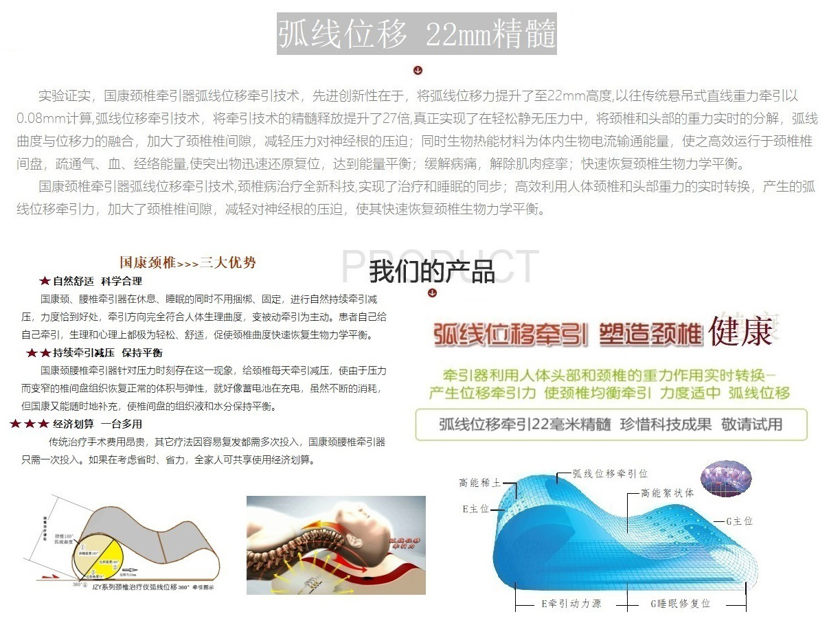 实验证实,国康颈椎牵引器弧线位移牵引技术,先进创新性在于,将弧线位移力提升了至22mm高度, 以往传统悬吊式直线重力牵引以0.08mm计算,弧线位移牵引技术,将牵引技术的精髓释放提升了27倍, 真正实现了在轻松静无压力中,将颈椎和头部的重力实时的分解,弧线曲度与位移力的融合,加大了颈椎椎间隙, 减轻压力对神经根的压迫;同时生物热能材料为体内生物电流输通能量,使之高效运行于颈椎椎间盘,疏通气、血、经络能量, 使突出物迅速还原复位,达到能量平衡。