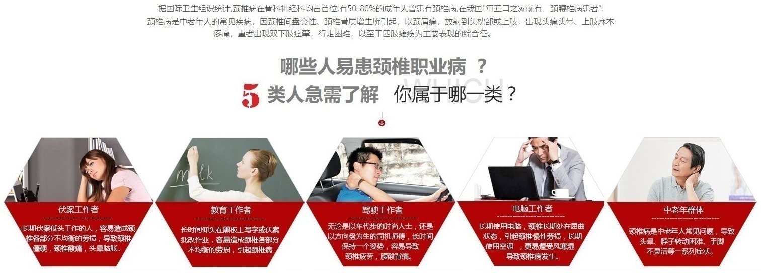 据国际卫生组织统计,颈腰椎病在骨科、神经科均占首位,有50%-80%的成年人曾患有颈椎病。在我国专家经过调查发现“五口之家有一颈腰椎患者”。