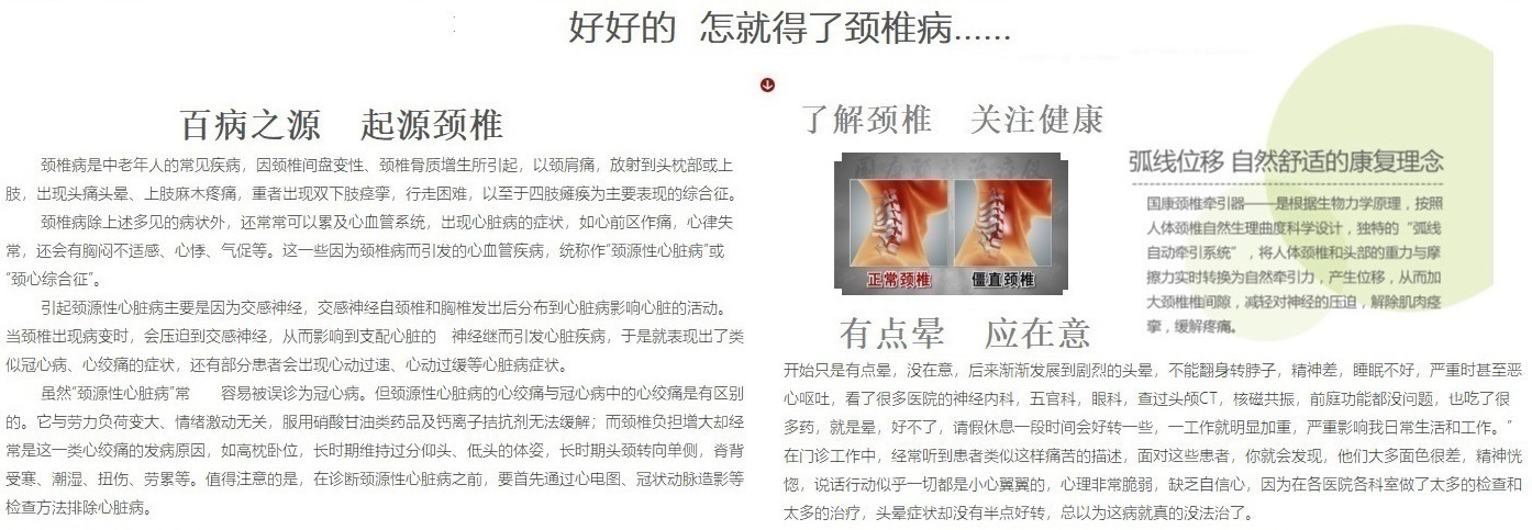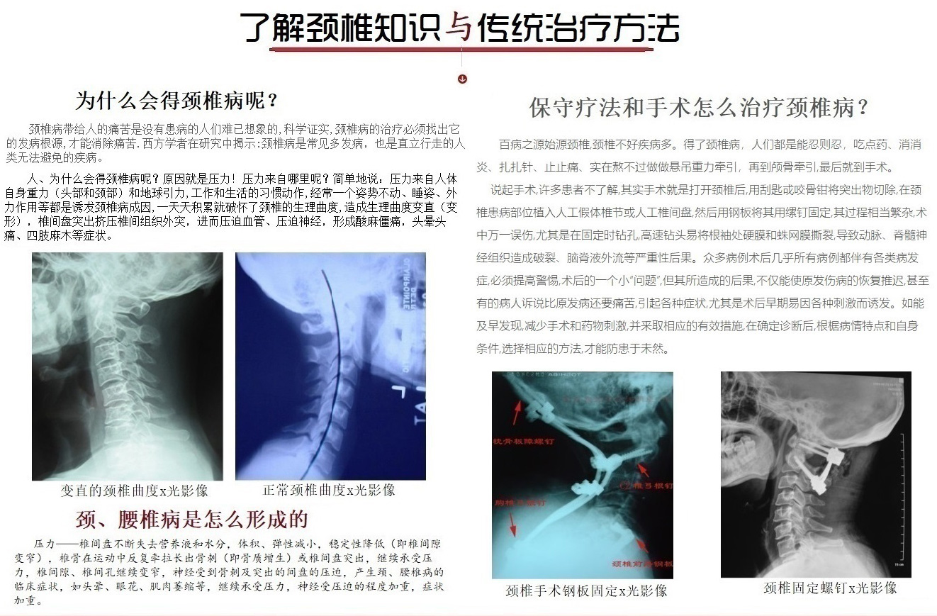 百病之源始源颈椎,颈椎不好疾病多。得了颈椎病,人们都是能忍则忍,吃点药、消消炎、扎扎针、止止痛、实在熬不过做做悬吊重力牵引,再到颅骨牵引,最后就到手术。
