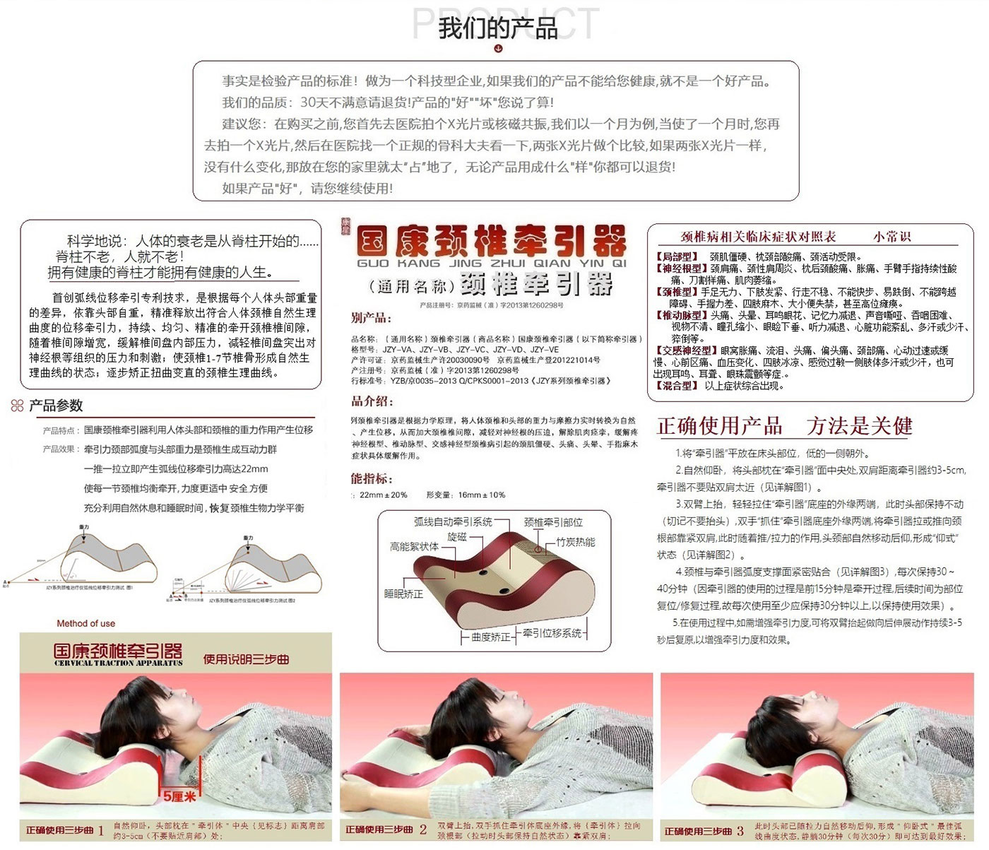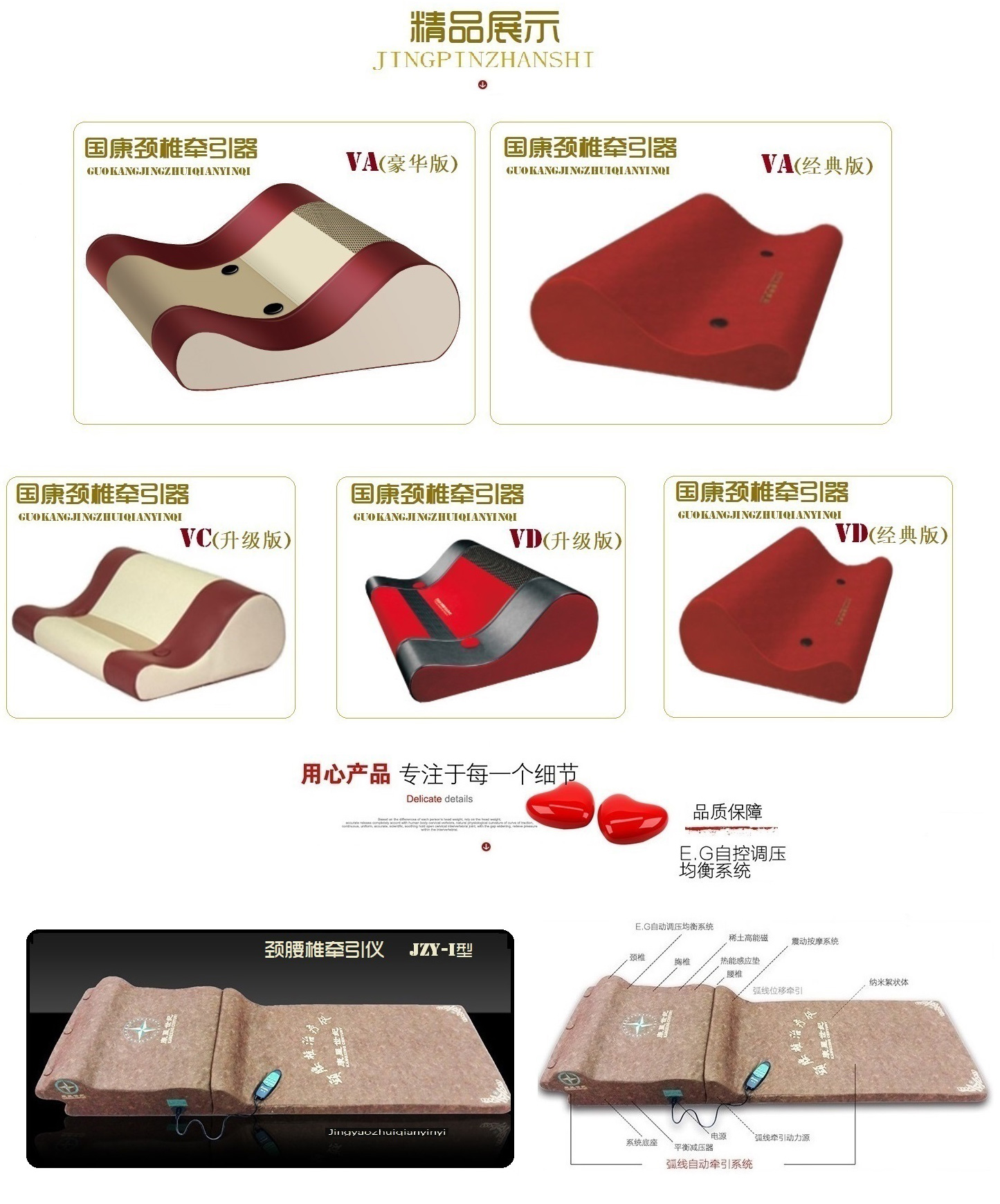 各型号使用功能提示.:VA型:高的一侧为牵引时用,低的一侧为睡眠时使用;VC.VD型高处为牵引使用;产品特点:国康颈椎牵引器利用人体头部和颈椎的重力转换为弧线位移牵引力;