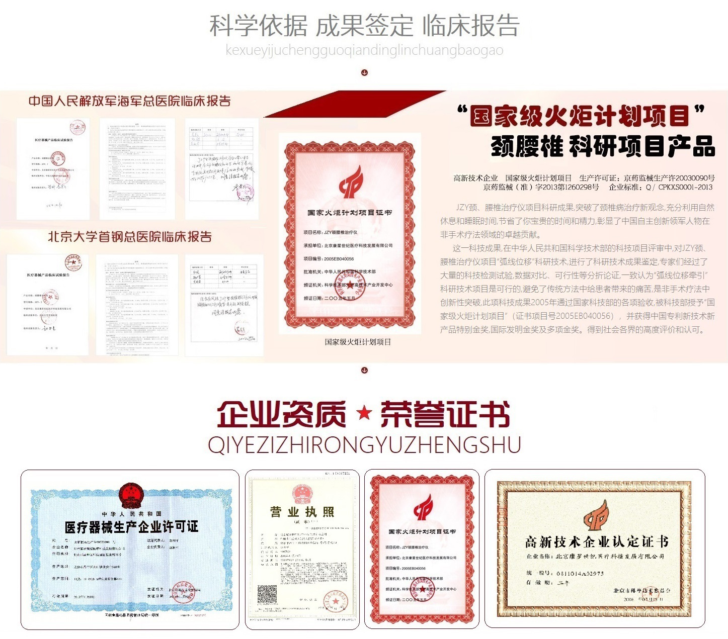 JZY颈、腰椎治疗仪项目科研成果,突破了颈腰椎治疗新观念,充分利用自然休息和睡眠时间,节省了你宝贵的时间和精力,彰显了中国自主创新领军人物在非手术疗法.领域的卓越贡献。