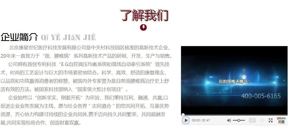 北京康星世纪医疗科技发展有限公司是中关村科技园区核准的高新技术企业,20年来一直致力于“颈腰椎病”系列高新技术医疗器械产品的研制、开发、生产与销售。