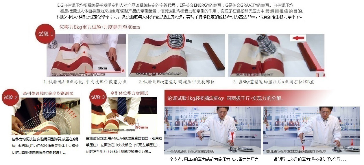 E.G自控调压均衡系统是指发明专利人对产品该系统特定的字符代号,E是英文ENERGY的缩写, G是英文GRAVITY的缩写。自控调压均衡是指通过人体自身重力来控制和调整产品的牵引装置, 使其达到均衡受力和牵引的作用,实现了在轻松静无压力中解除病痛的目的。